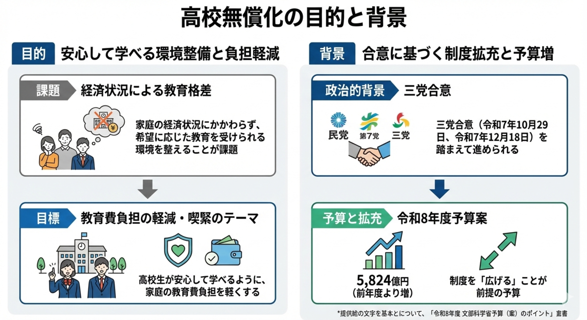 まずは制度の「目的」ですが、資料では、家庭の経済状況にかかわらず、希望に応じた教育を受けられる環境を整えることが課題だとされています。